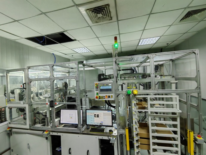 畜牧業(yè)智能儀自動產(chǎn)線,包含自動上料,銑水口,射頻檢測,激光打碼,視覺檢測,自動裝盒及整個的EMS系統(tǒng)。